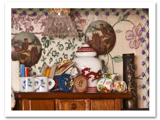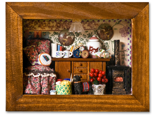 Un comò, una poltroncina e la stufa che riscalda l'ambiente sono gli elementi principali dell'arredamento, nel dettaglio i piccoli oggetti le stoffe, i fili, i gomitoli di lana, la carta da parati e il telaio per il lavoro a punto croce, caratterizzano questa roombox.